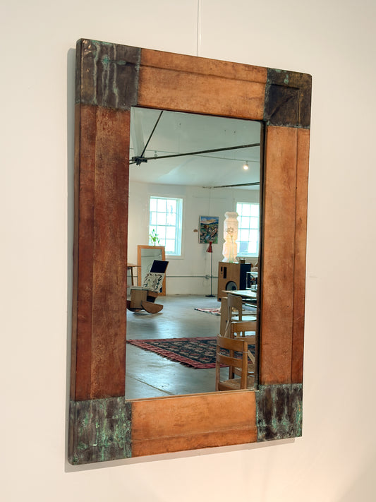 Scandinavian Leather Mirror with Patinated Copper Corners c. 20th Century