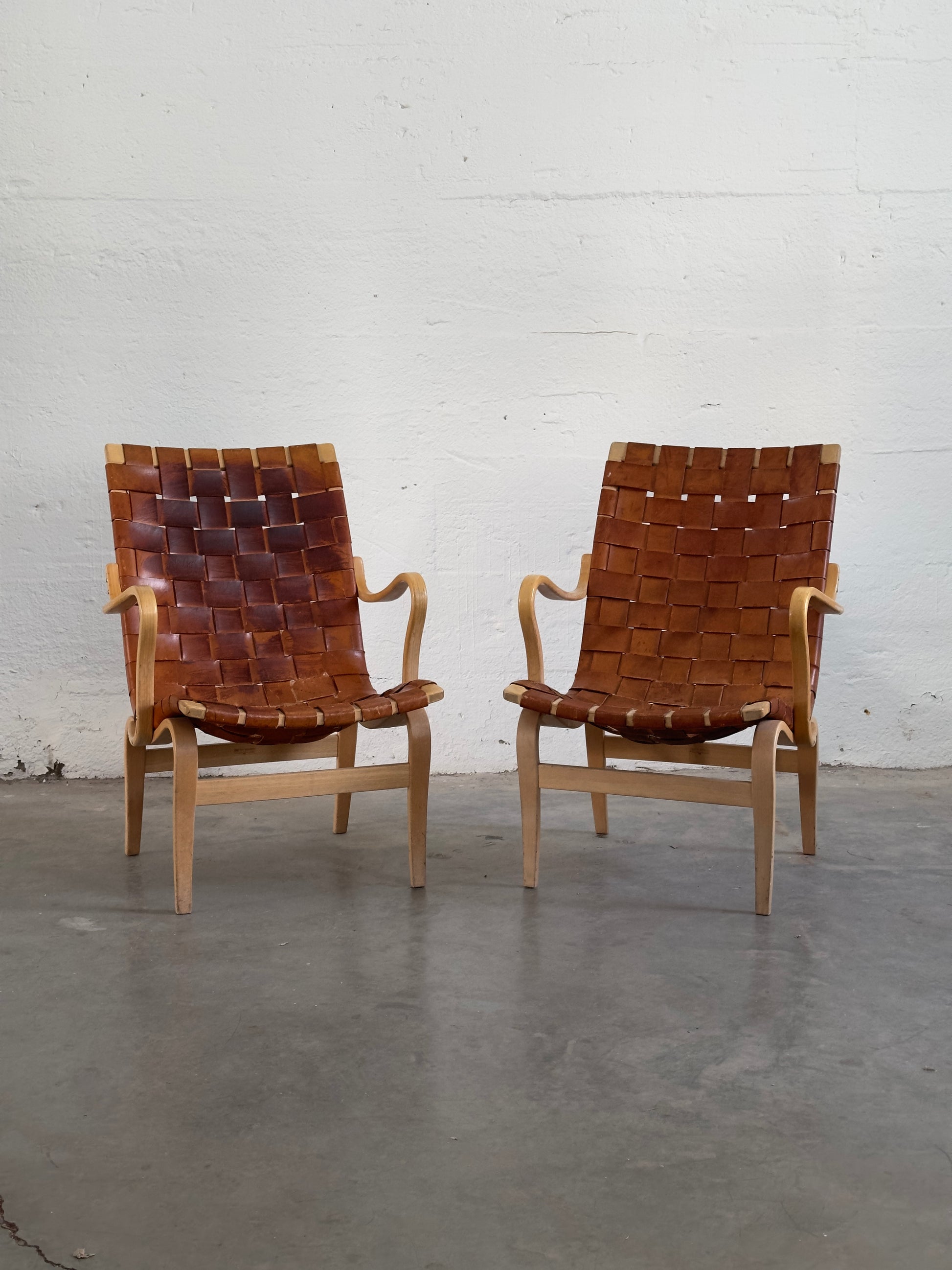 Designed by Bruno Mathsson, this pair of Eva armchairs was produced by Firma Karl Mathsson in Värnamo, Sweden, circa 1968. The chairs wooden frames is made up of layer-glued beech and birch, paired with original braided leather upholstery. The Eva model is celebrated for its ergonomic form and light, expressive construction, exemplifying Mathsson’s contribution to Swedish modern design.