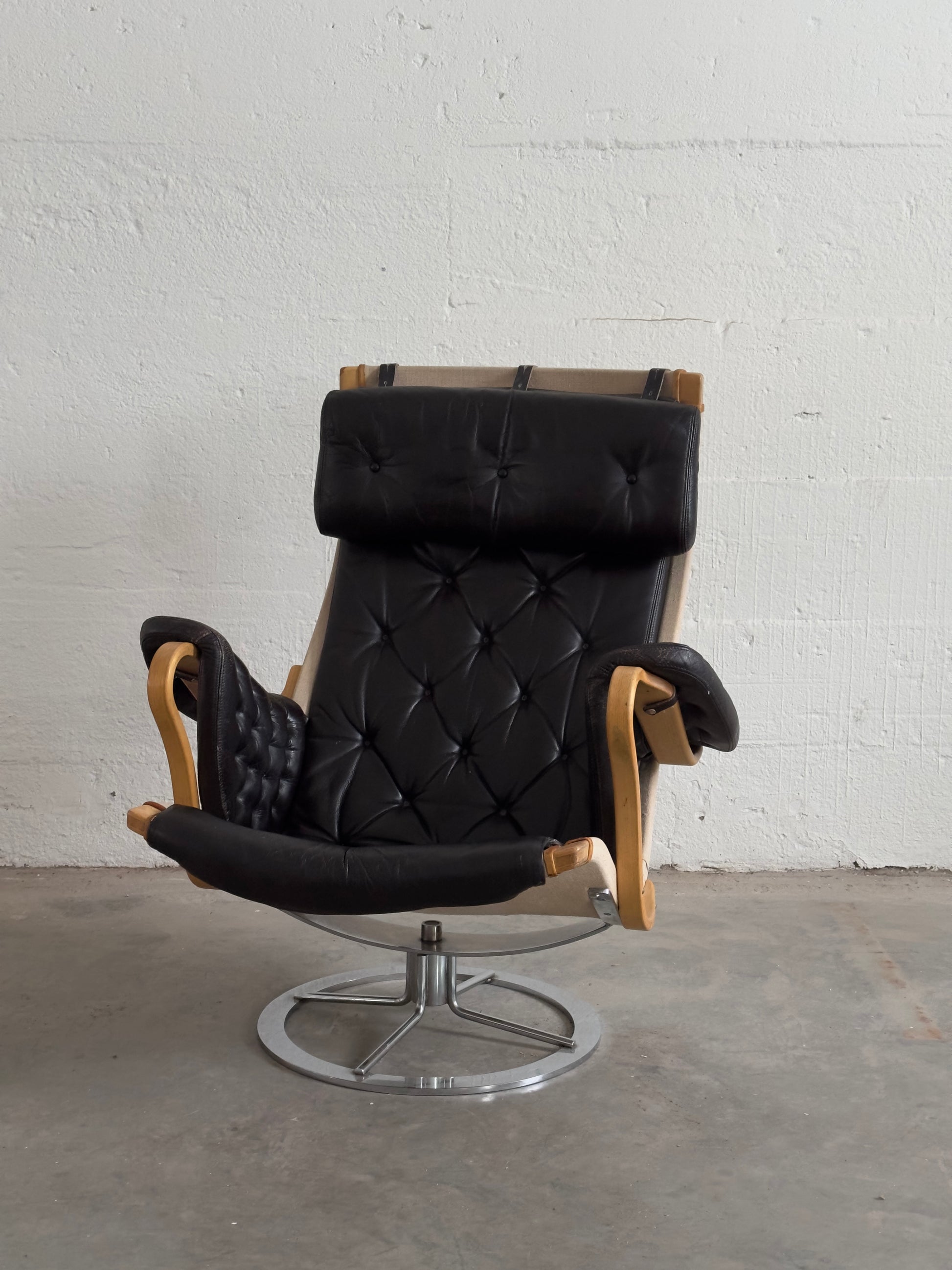 The iconic Pernilla chair designed by Bruno Mathsson, manufactured by DUX. Constructed with a beech frame on a chromed swivel base and upholstered in black leather, accompanied by the matching ottoman. A benchmark of ergonomic Scandinavian Modern design.