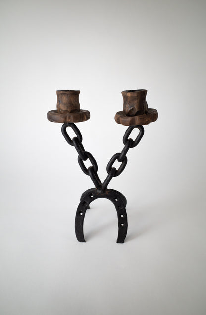 Vintage Chainlink Horseshoe Candle Holder, maker anonymous. Candleholder is made in walnut and the chain and horseshoe body in patinaed metal.