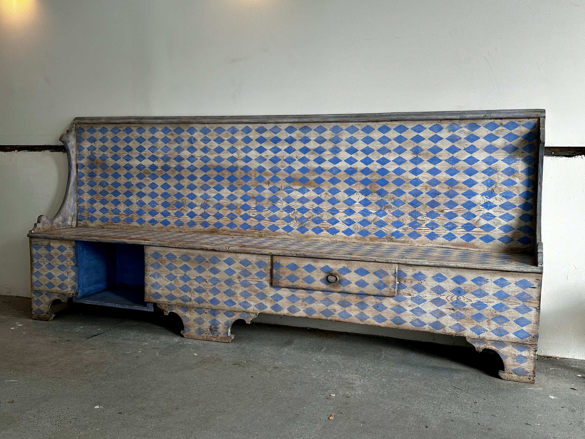 Large Italian Painted Bench with Blue and White Harlequin Pattern, 19th C