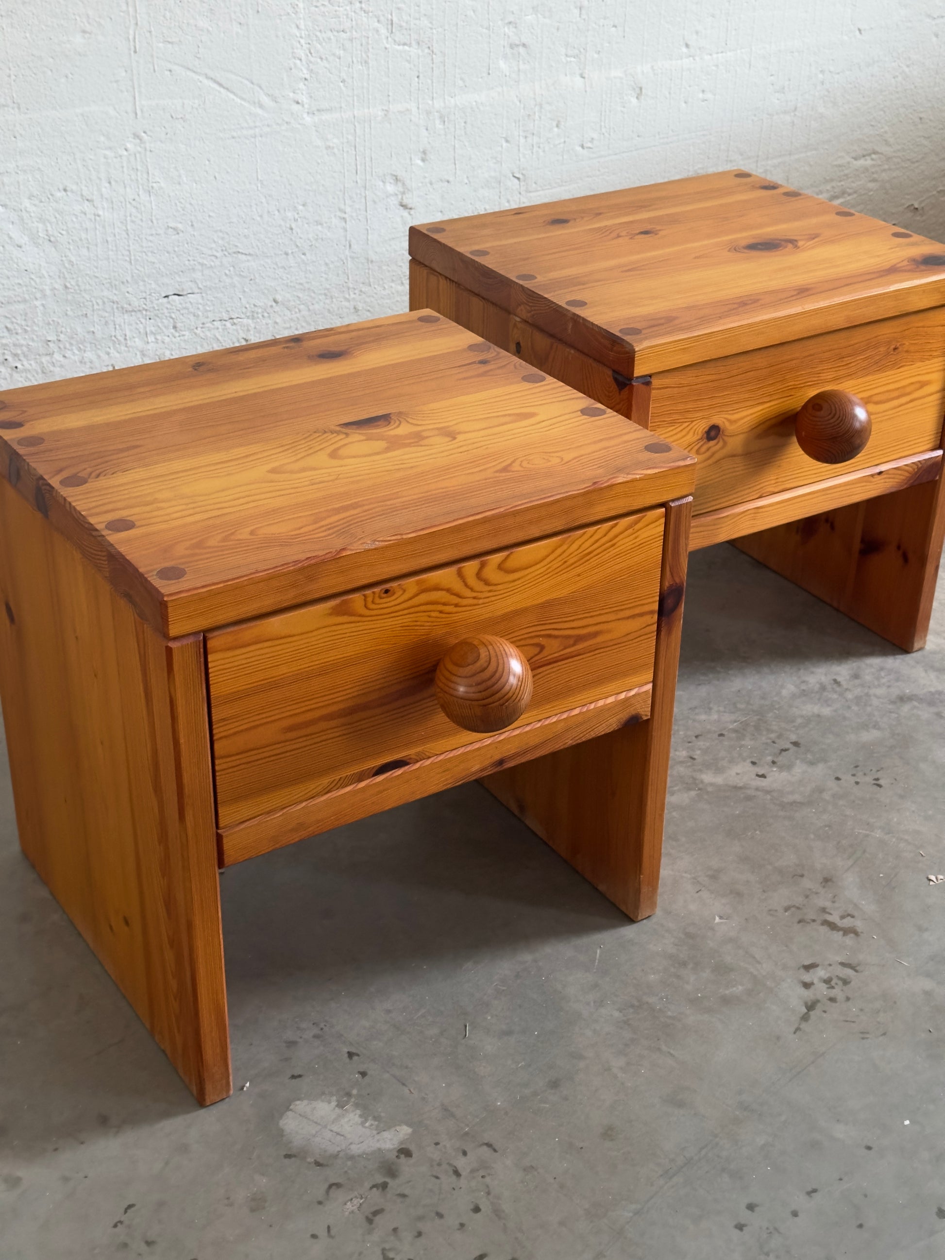 A pair of bedside tables from 1970s Sweden, crafted in pine with a clean, straight form and accented by a single drawer with a rounded knob. The design is straightforward and functional, with warm tones typical of Scandinavian furniture of the era.