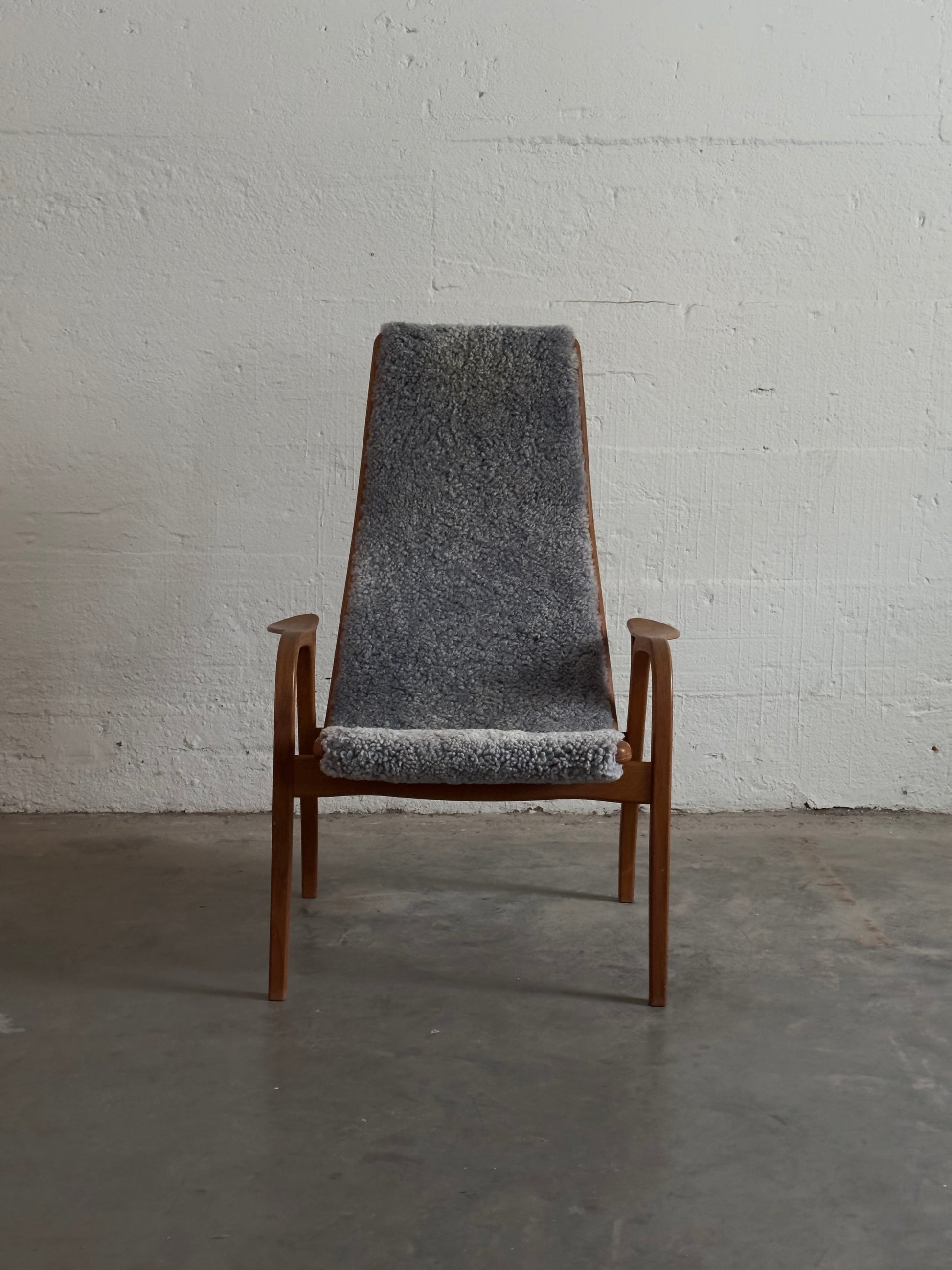 A Lamino armchair with footstool by Yngve Ekström for Swedese, featuring an oak frame and grey sheepskin upholstery. A refined example of Swedish Modern design, offering sculptural presence and exceptional comfort.
